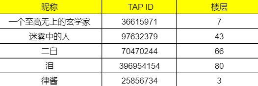 叮咚~刀妹来为少侠们开奖啦!经过认真评选,本次福利活动获奖名单公布如下,恭喜获奖的少侠!感谢每一位少侠的参与,没有获奖的少侠也请不要灰心,多多关注刀妹,Tap专属福利送不停!说不定下一个幸运儿就是你ღ( ´・ᴗ・` )
