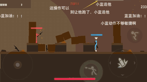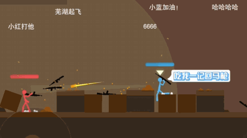 随后在你来我往的攻势下,战斗进入了白热化阶段小红此时祭出必杀技——红莲连射;小蓝使出毕生绝学——蓝射掌控。但是,戏剧性的一幕发生了疯狂输出的小红竟然没子弹了!本来抱头鼠窜的小蓝迅速掌握主动权,小红节节败退在没有掩体的情况下无奈被小蓝击败,也恭喜小蓝获胜!