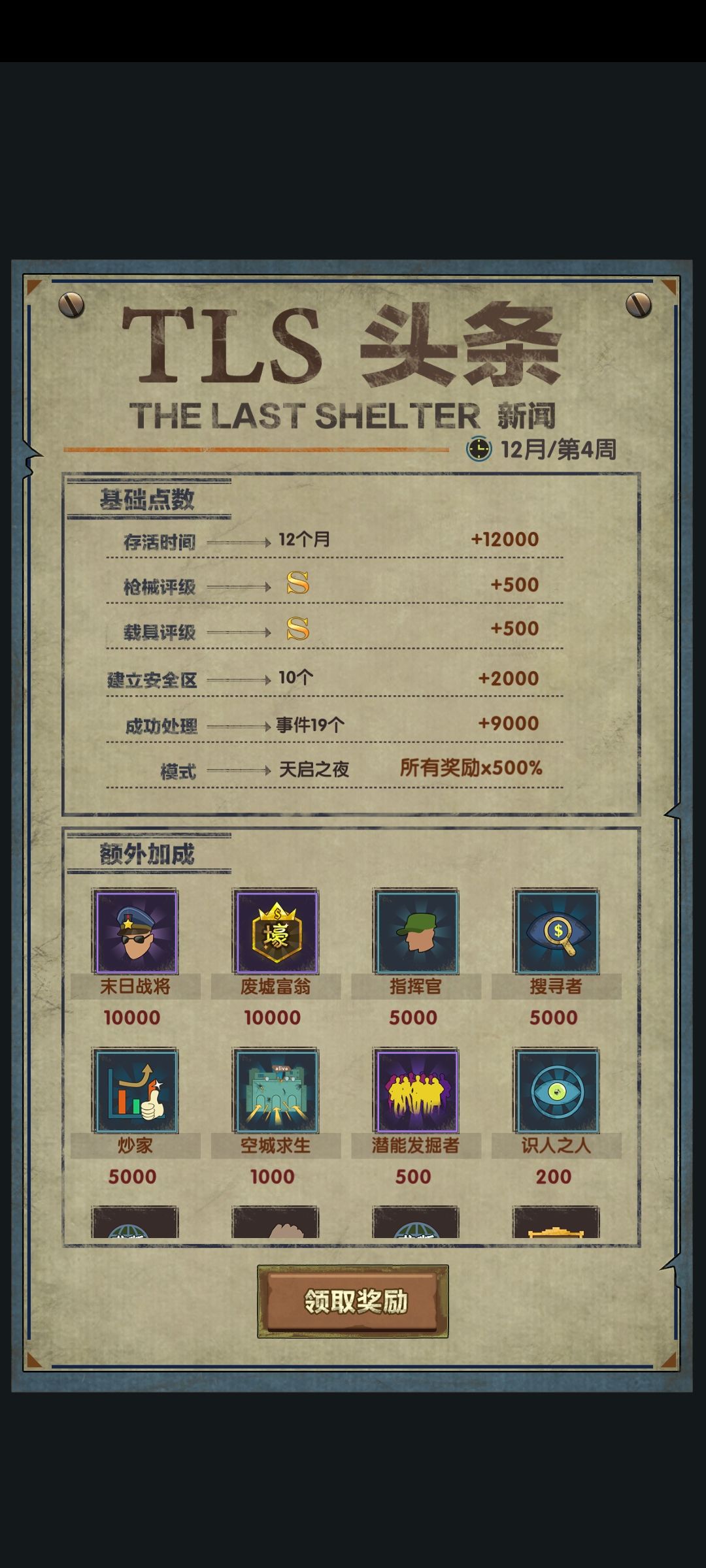 过程:起手爆米花刷黑市拿到第一桶金,交换出狂人,然后开始倒卖武器,力求每周把钱花光,就这么简单。过程中可以去进行力所能及的探索/打野,注意别把人饿着了。虽然只有5人口,但普通天启最后一波红月战力也只有7.8W,5把顶级武器+3星枪迷+其他战斗人员+工事,实际战力过1.5倍红月也绰绰有余。缺点:资金滚动效率太差,导致战力提升速度过慢,跟不上野区发育速度,安全区升级也相对不划算,所以总体评分偏低(天启总分甚至比不上噩梦17,其效率之低下可见一斑)。