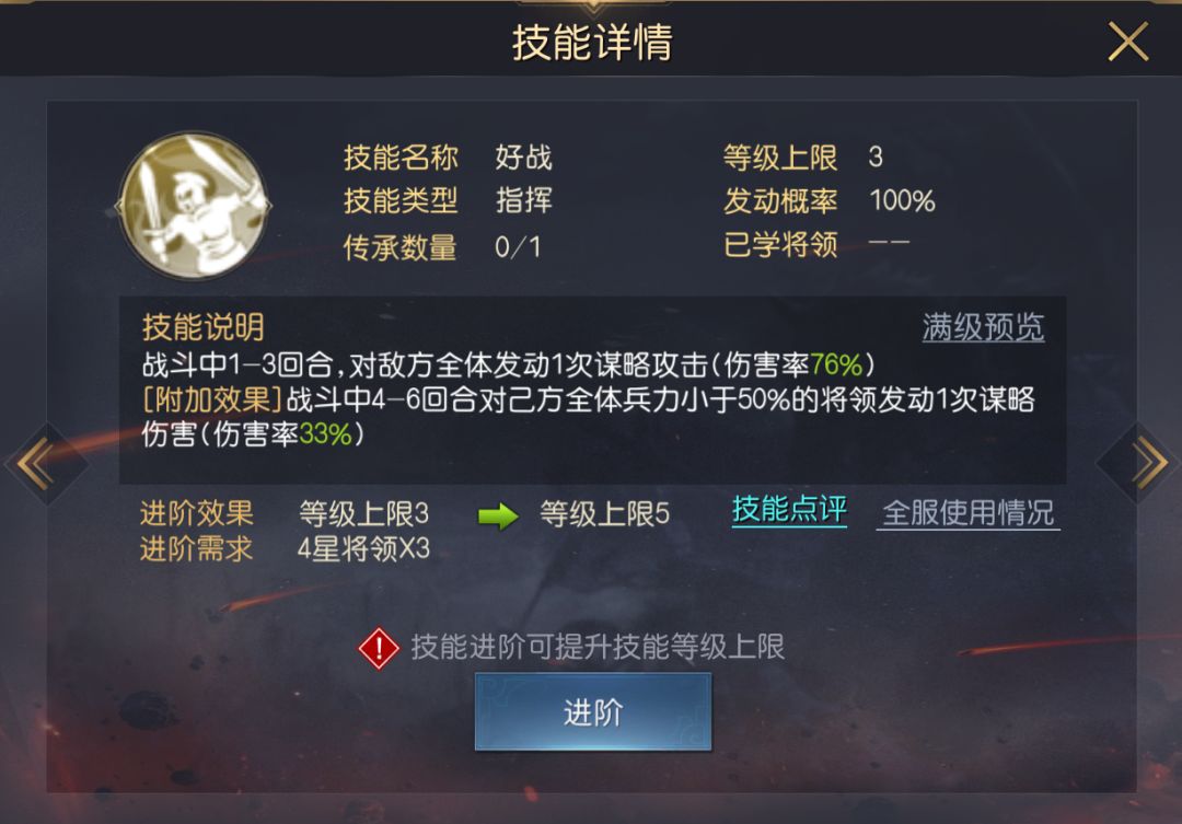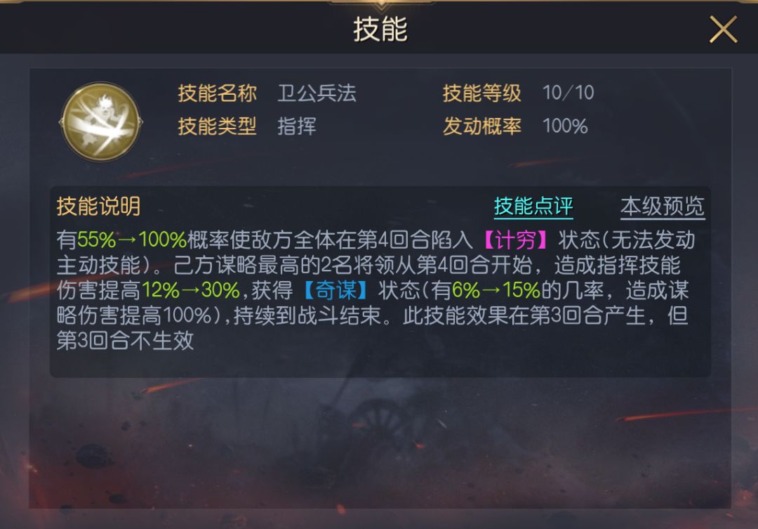 卫公兵法不但能在第4回合必定施加全体计穷,该技能还有一个特殊机制,第3回合便施加计穷,但4回合时才生效,意味着无论敌人的速度是多少,计穷效果都能在第4回合率先触发,容错率非常之高。除了计穷效果外,该技能会在4回合开始为己方2名谋略最高的将领提供指挥伤害加成与奇谋加成,兼并增益与控场效果,但也一定程度上限制了李靖的阵容搭配空间。