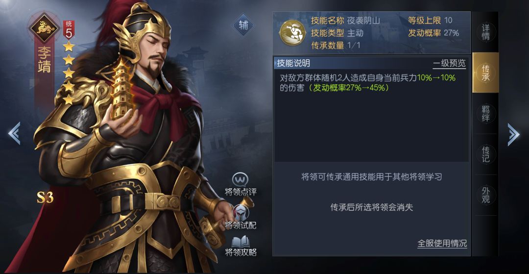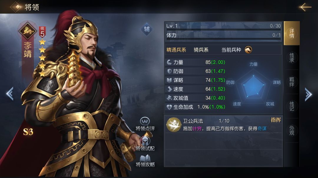 李靖是S3九州阵营的一名5统将领,他能在特定回合稳定施加全体计穷,并能在后续回合为己方队友提供不错的指挥加成与奇谋效果。这名将领受限于属性成长,力量与谋略都不算突出,并不适合携带数值计算的辅助技能,更适合使用忠诚护卫、圣像庇佑、人间传说等带有直接效果的功能性技能。