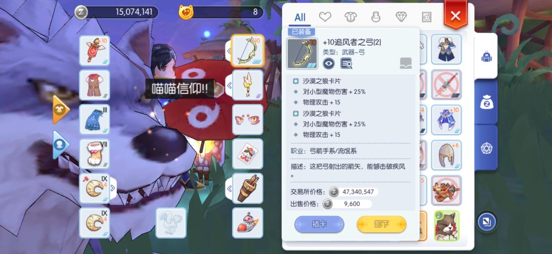 沙漠之狼卡片两张,能够提供50%的小体型伤害和30攻击,30万