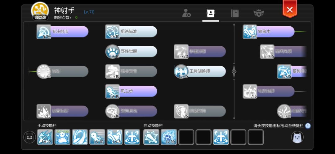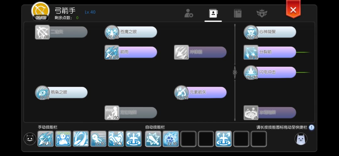 因为分裂箭冷却是70秒,其他技能要么60秒要么30秒,分裂箭的存在会导致整个技能节奏混乱,所以我将狙击,风之步,蓄势待发,星辰放在备战,分裂箭放在外面,每次能节约200蓝,并且不会频繁施法。风之步一次持续10分钟,也可以放在外面,但是他只有20点蓝耗,所以随意。