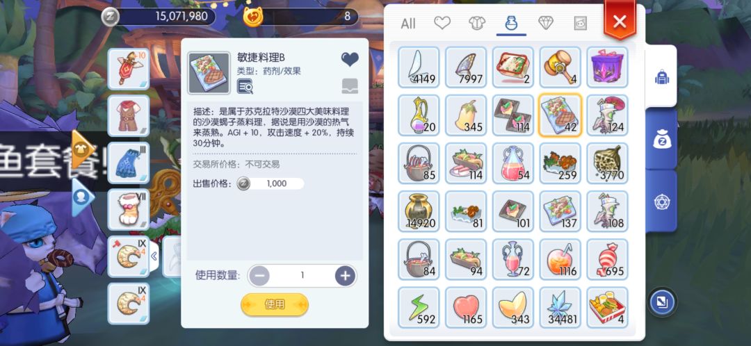 以上准备就绪,下一步我们就该挂机了,我选择的是克魔岛海滩只有他是小型怪多,沙漠之狼对小型比对属性多10%伤害。他有三类怪,因为流氓是人型和中型,所以不在挂机范围。我的出装是针对土的,所以选择挂企鹅。饰品卡只有对地增伤20%的卡浩便宜好弄,螃蟹是水,水增伤的也可以考虑一下,但是饰品水卡2.4亿一张,抢购。饰品风卡是个mvp卡,自己品。