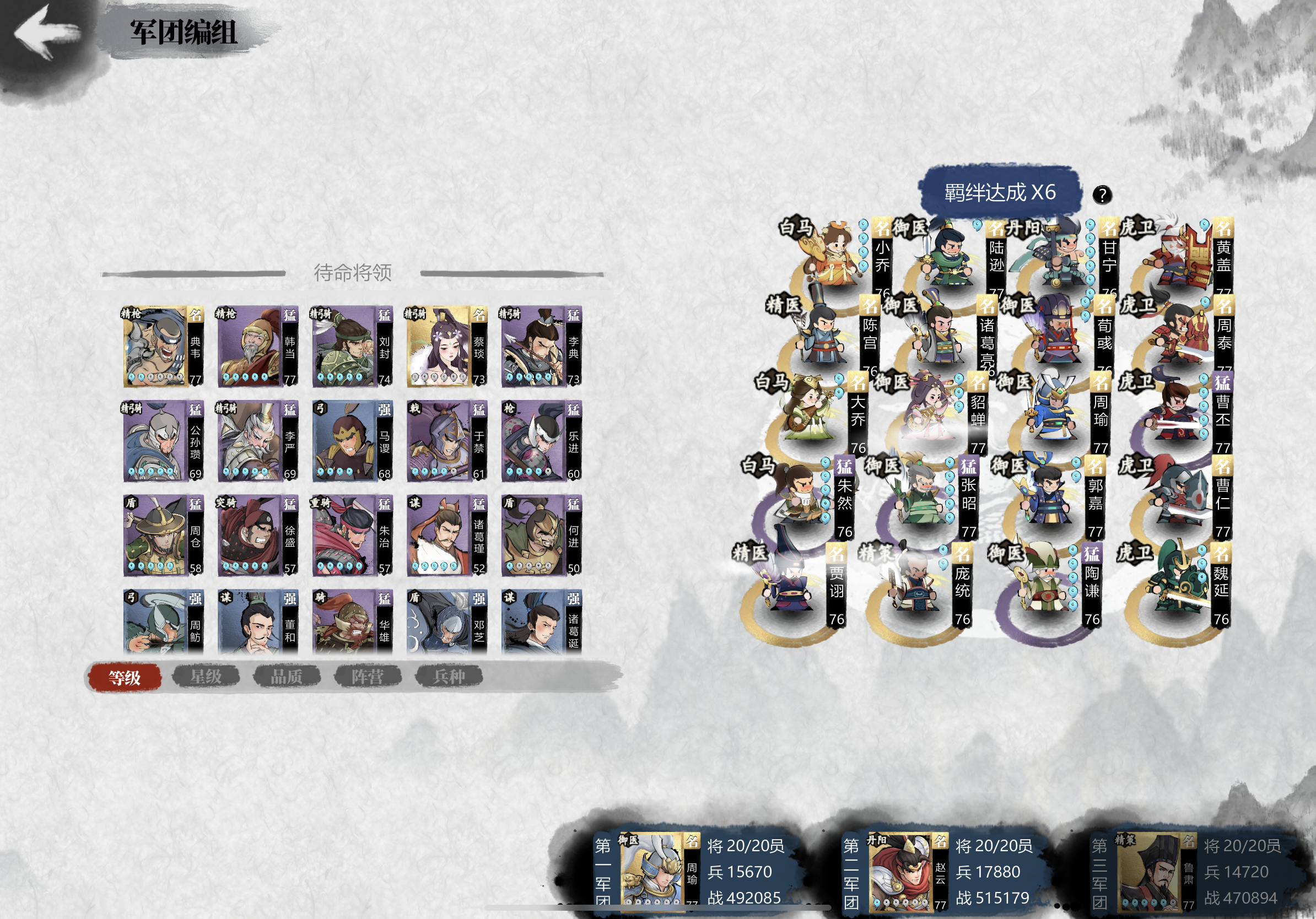 郭嘉荀彧在这就是神呀,曹丕后期有点扛不住,所以留了个高星的闪避枪甘宁后备,而且在第一排第二列可以用来拦骑兵。其他几个前排就没倒过,曹仁的被动真的强,零星都没问题。没有索敌,只有对面第一排有突骑的时候用甘宁索敌。后期推城还是要靠流言逃兵削一轮再上,等级低没法一穿六😂就是逃兵流言反复折磨。