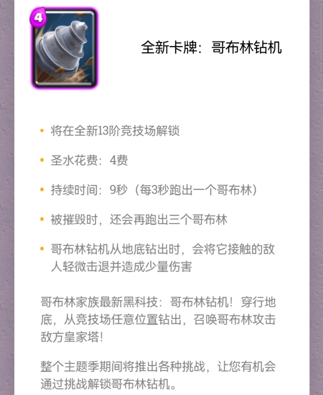 第一只哥布林在钻机钻出1秒后才出现。这项调整与《皇室战争》的运行机制有关。CR下牌后并不是瞬间登场,而是有1秒左右的时间差。正是因为这时间差,CR才能规避网络波动和延迟,打造全球同服的实时竞技游戏。所以1秒后才出现让玩家可以先观察钻机位置再下牌,不需要像调整前那样预判。少于1秒则可能仍需预判(不清楚具体的时间差长度)。