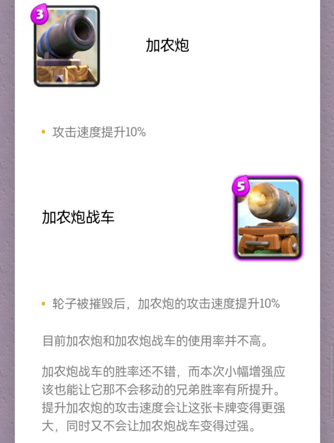 从实装后的使用效果看,加农炮的影响不大,炮车的进攻能力有所加强。