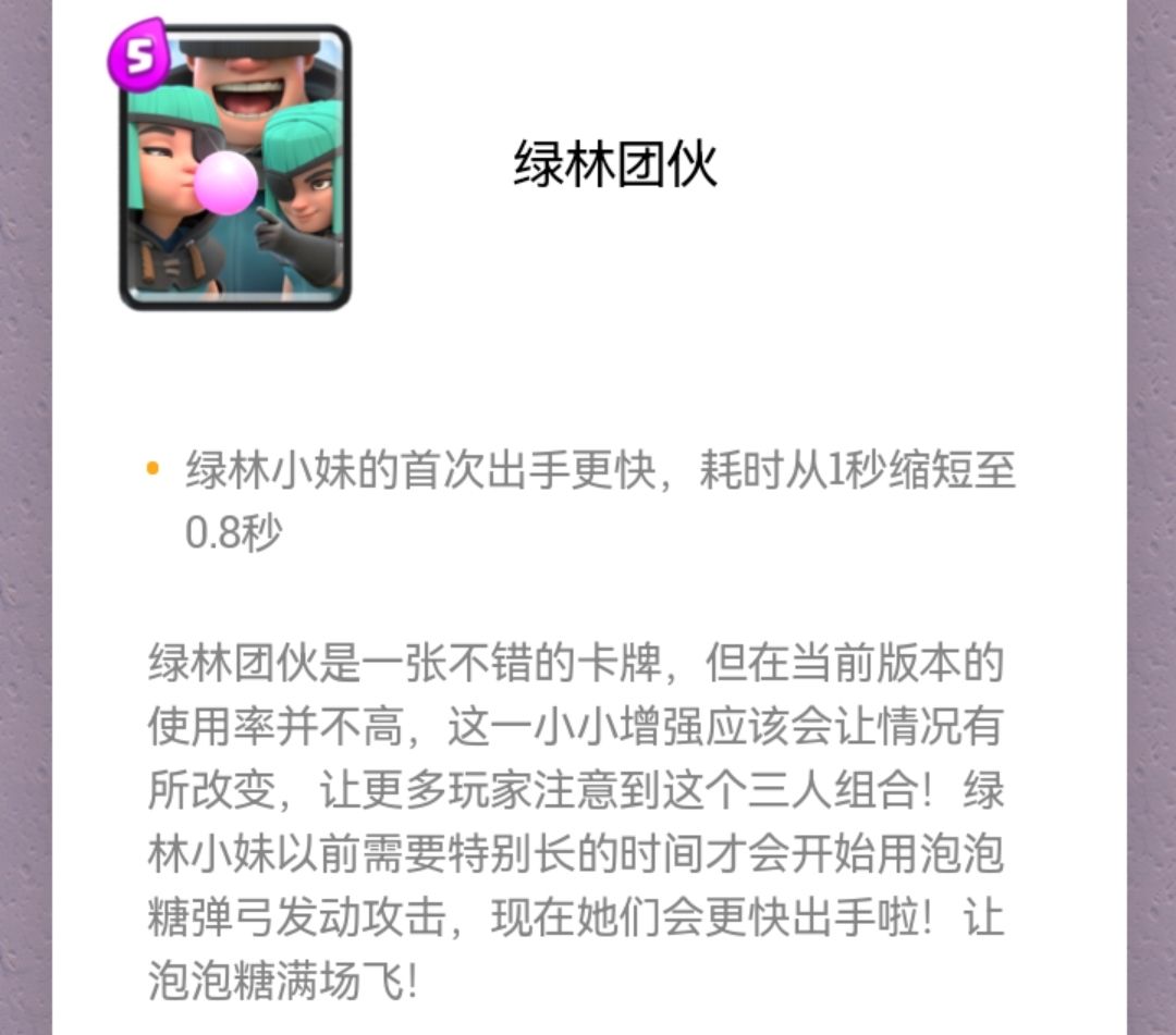 绿林和后面提到的炮车都是有点特殊的存在。特殊在卡牌强势时可以归入防守核心,进入CR的顶级生态位——核心的行列。