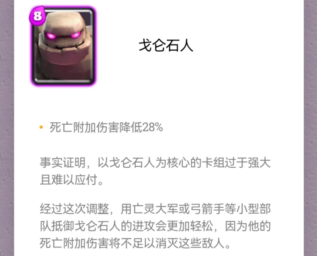 骷髅巨人的调整很符合卡牌特性。上次调整时笔者认为骨巨不可能增加亡语伤害,但现在只能说真香。不只是骨巨,上次的女巫(射程增加0.5格)、这次的精锐虽然都是只是微调,但都有眼前一亮的感觉。今后类似的微调应该不少。