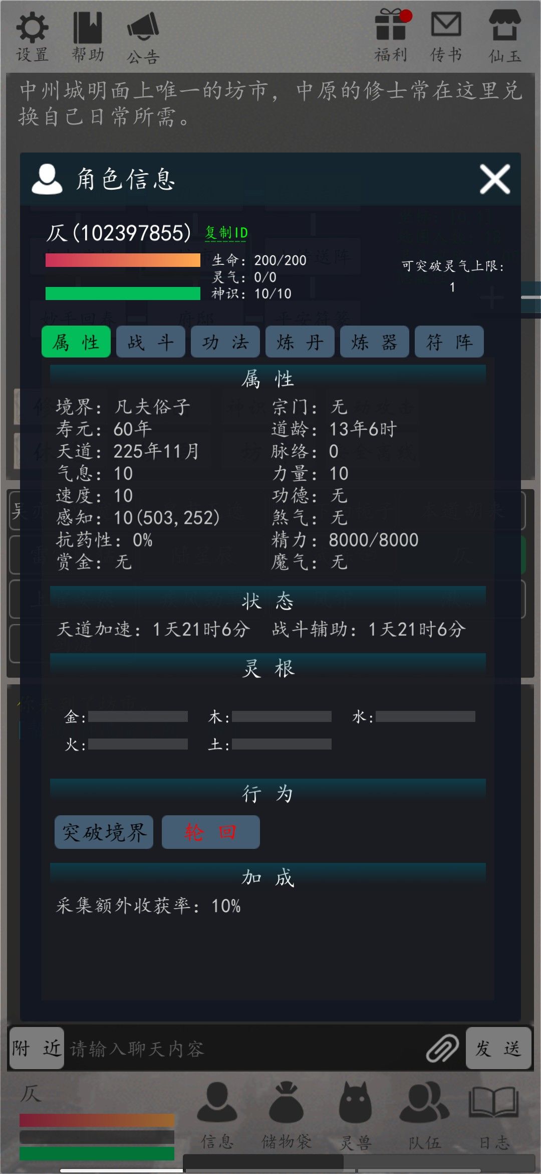 刚开始玩游戏或许有些懵,刚创完人物时是凡人境。但是系统会送你三天的天道加速,第一世时,你可以在帮助频道喊别人送5仙玉