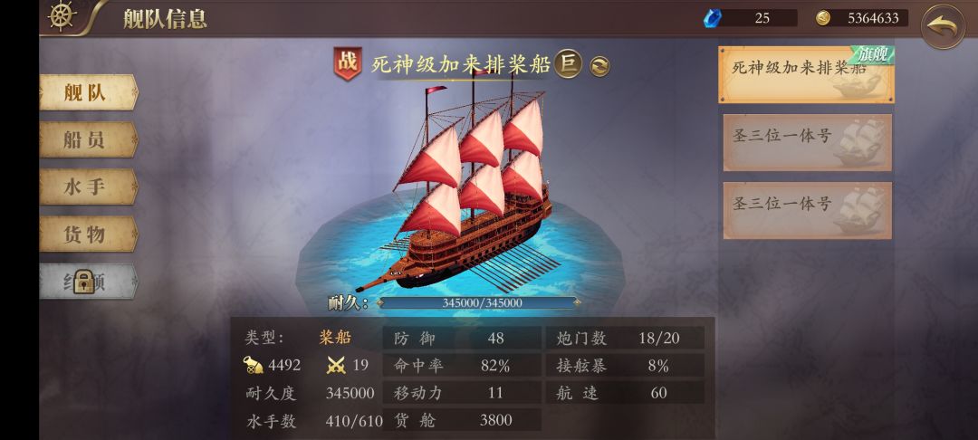 现在有点后悔买死神了,应该都买圣三的,死神前期抢劫是很好用,但后期不如炮船,而且这游戏的排船续航很有问题,一队排船出门只能跑两天,就离谱,因为这个原因很不喜欢排船。