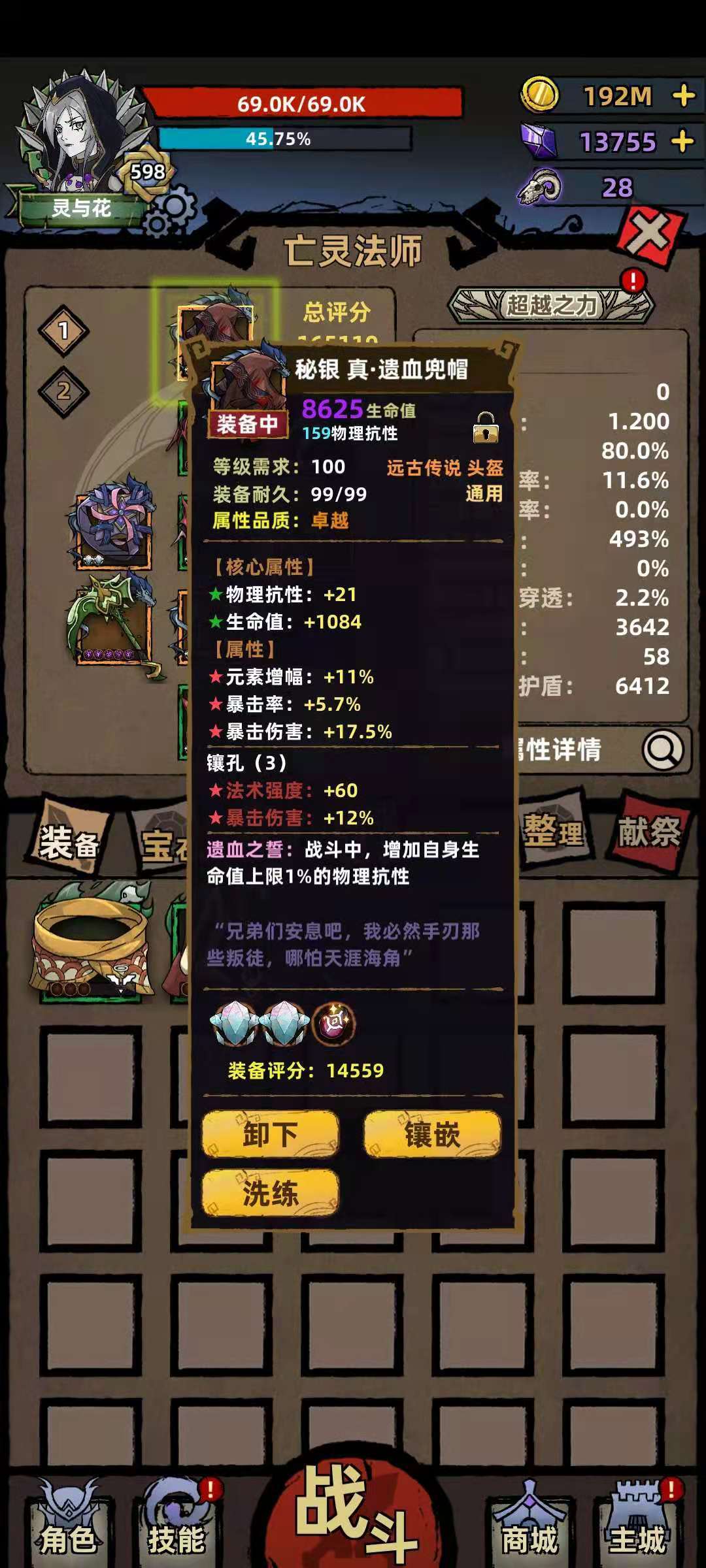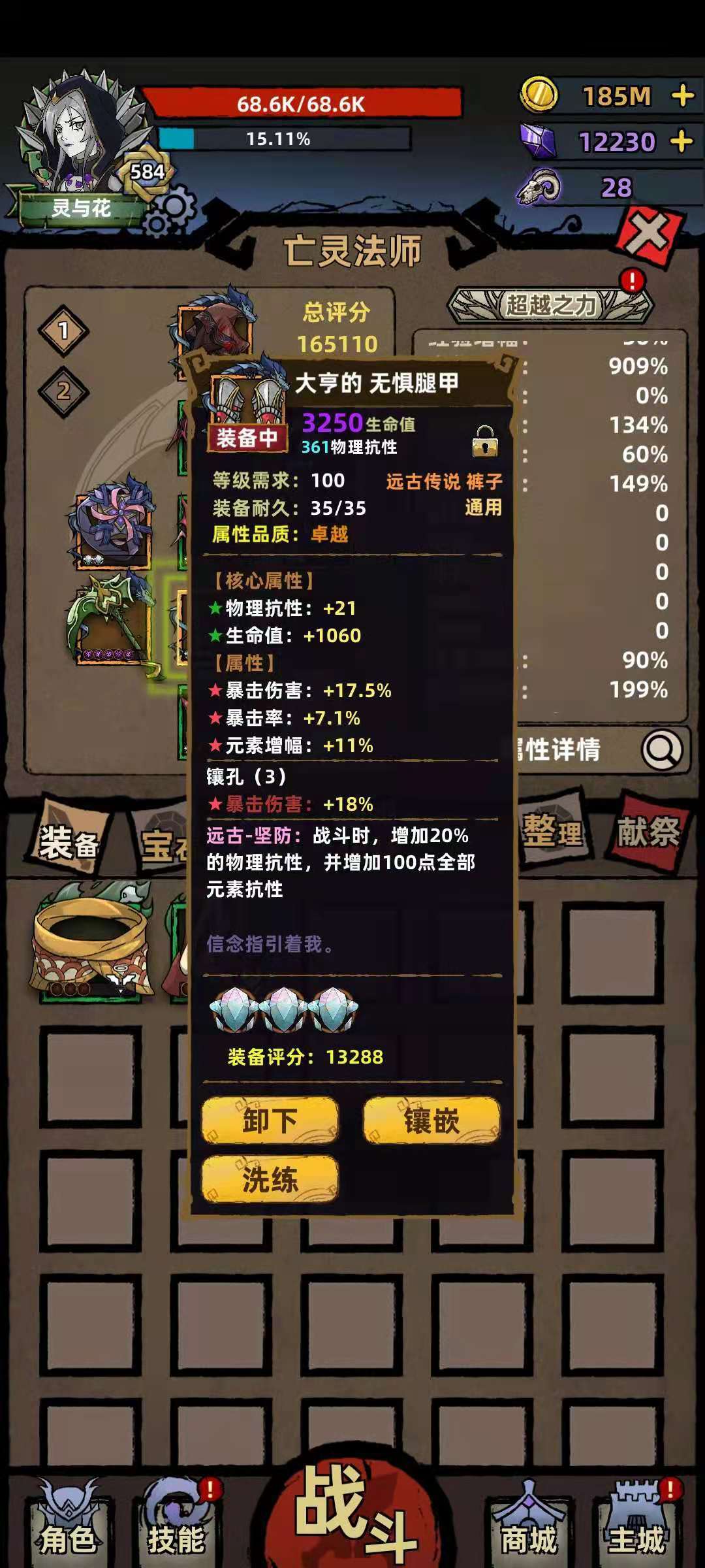 我的特效才1%,最高的是2%,翻我一倍,还没刷出来(又得提到天天爬塔不看装备就分解这个问题了),为了个三属性三孔已经很难了。。。这是按照你的血量上限来提高物抗的装备,血越多物防越高,根据我的观察猝死基本都发生在爬塔的大刀哥,特别是第一回合两个大刀哥贴脸,或者两个转转哥没秒掉一个,这类情况直接抬走吃席。所以,物抗要增加,当然元素抗也不能扔,于是又一件垃圾被我翻出来了,如图:
