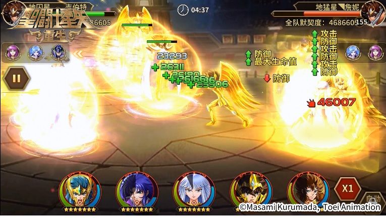 我方阵容:传说圣斗士·星矢、白羊座·贵鬼、冥衣·撒加、神圣水瓶座·卡妙、北欧圣女·希露达
