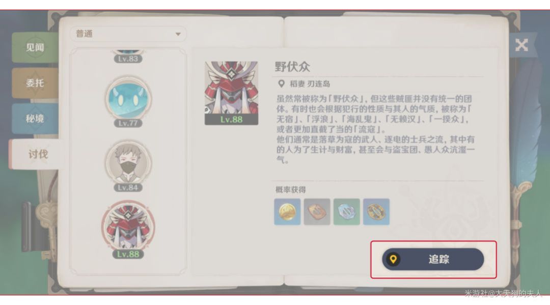 如果我们跟游戏界面左上角的讨伐”追踪“,它只会指引你讨伐鸣神岛上一小部分的「野浮众」,剩下的(包括八酝岛和神无冢)它都不会指引。