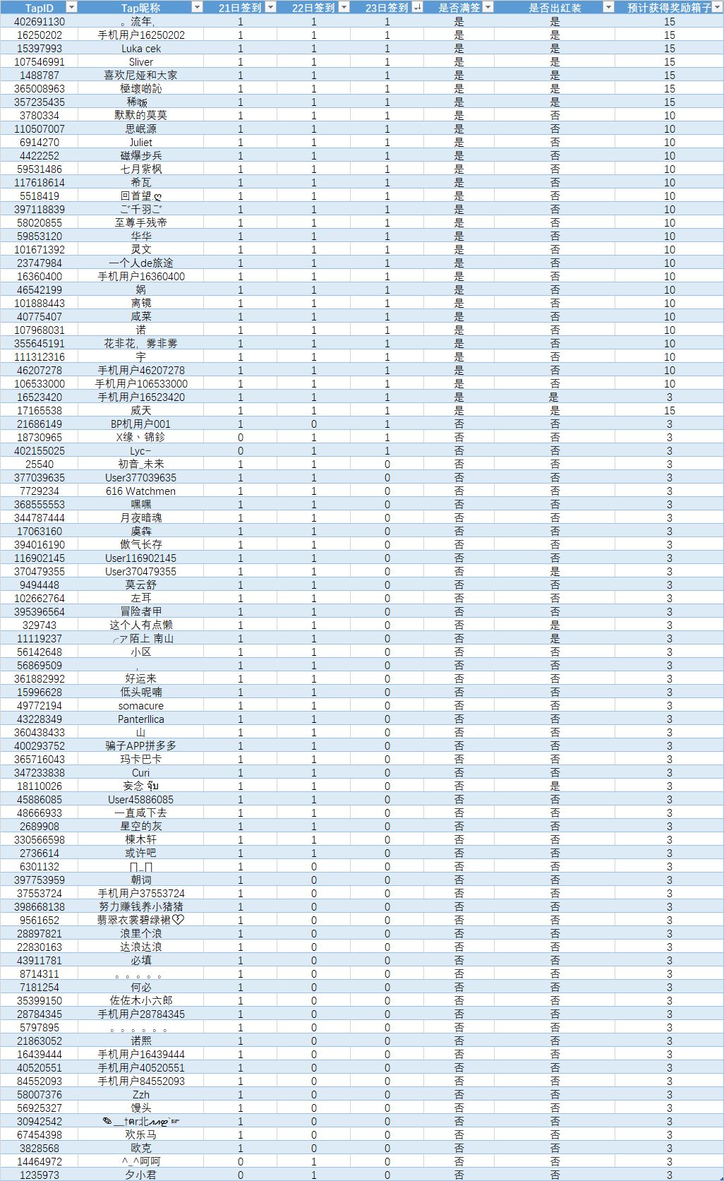 表格上面显示断签的同学,因为平台发帖审核的原因,我这边还没有看到,所以初步统计的名单中有可能存在错误的情况哦,如果发现表格统计不对,可以在评论里面指出,或者在玩家群里面找我反馈哦!考虑到大家签到不易,所以断签也会收到3个装备宝箱的奖励哦~
