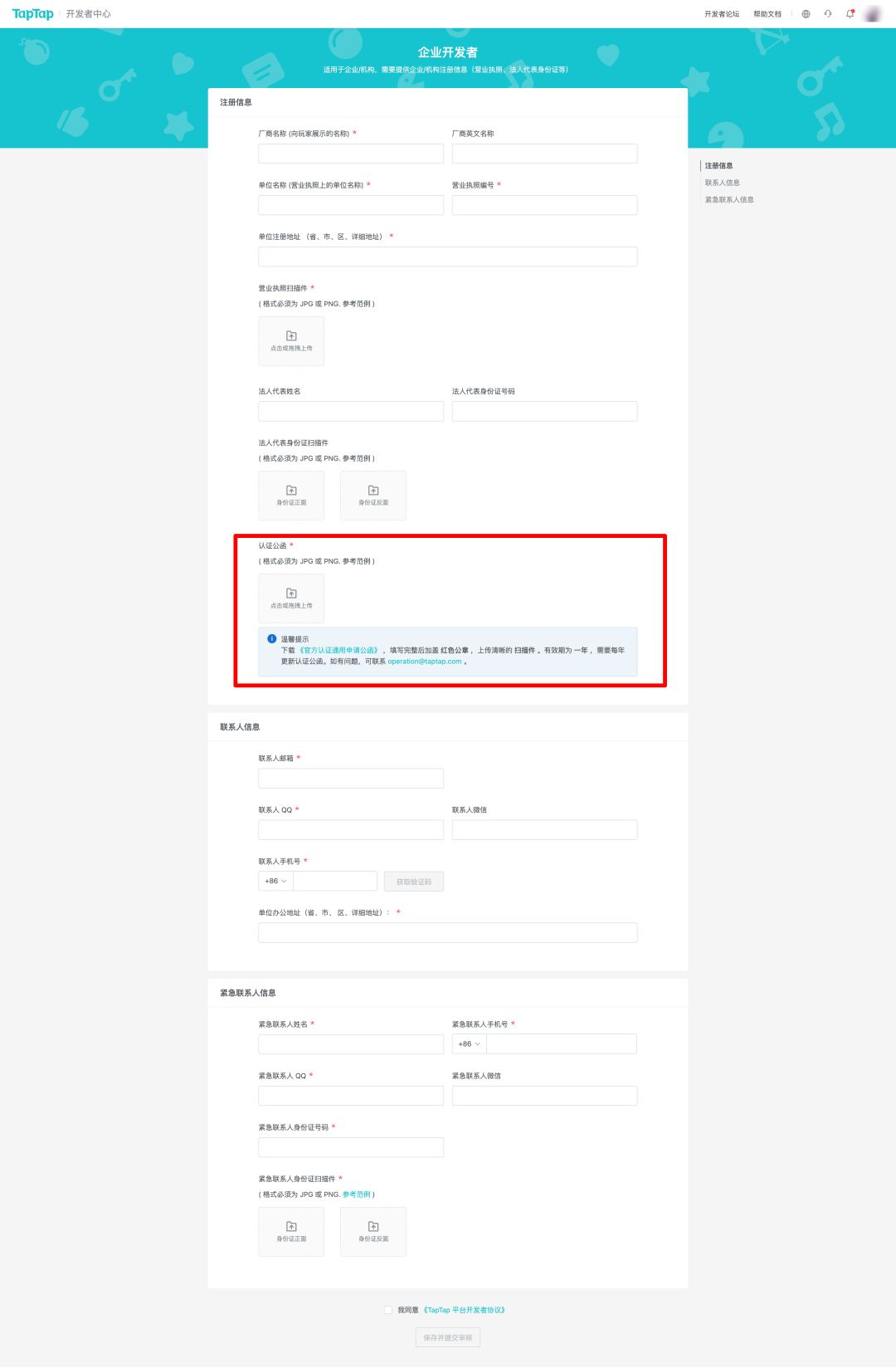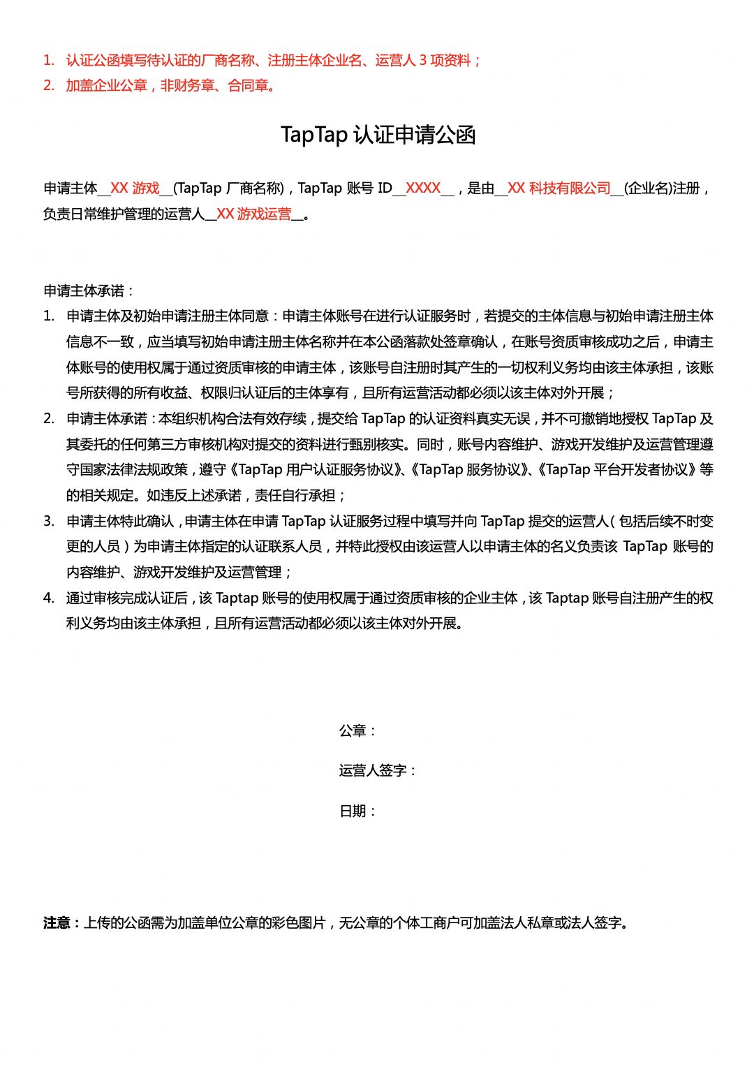 为了有效保障企业级开发者在 TapTap 开发者中心的使用权益及账户安全,在申请创建【企业开发者】需要开发者上传《TapTap认证申请公函》,公函内需要填写申请主体(厂商名称)、注册主体企业名称、该主体授权管理的 TapTap 账号ID,并加盖企业公章如图 1,申请公函示例请见图 2 。TapTap 认证申请公函有效期为 1 年,到期后需要超级管理员在【厂商设置】-【账号信息】更新授权公函,不更新公函则开发者无法继续使用TapTap开发者中心。