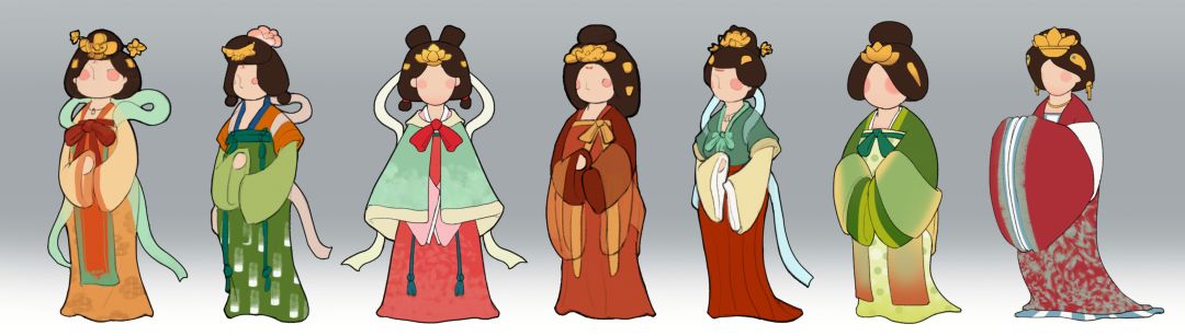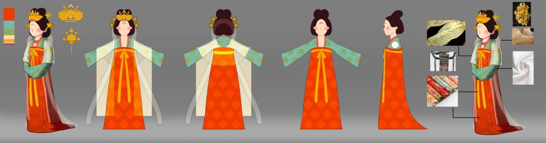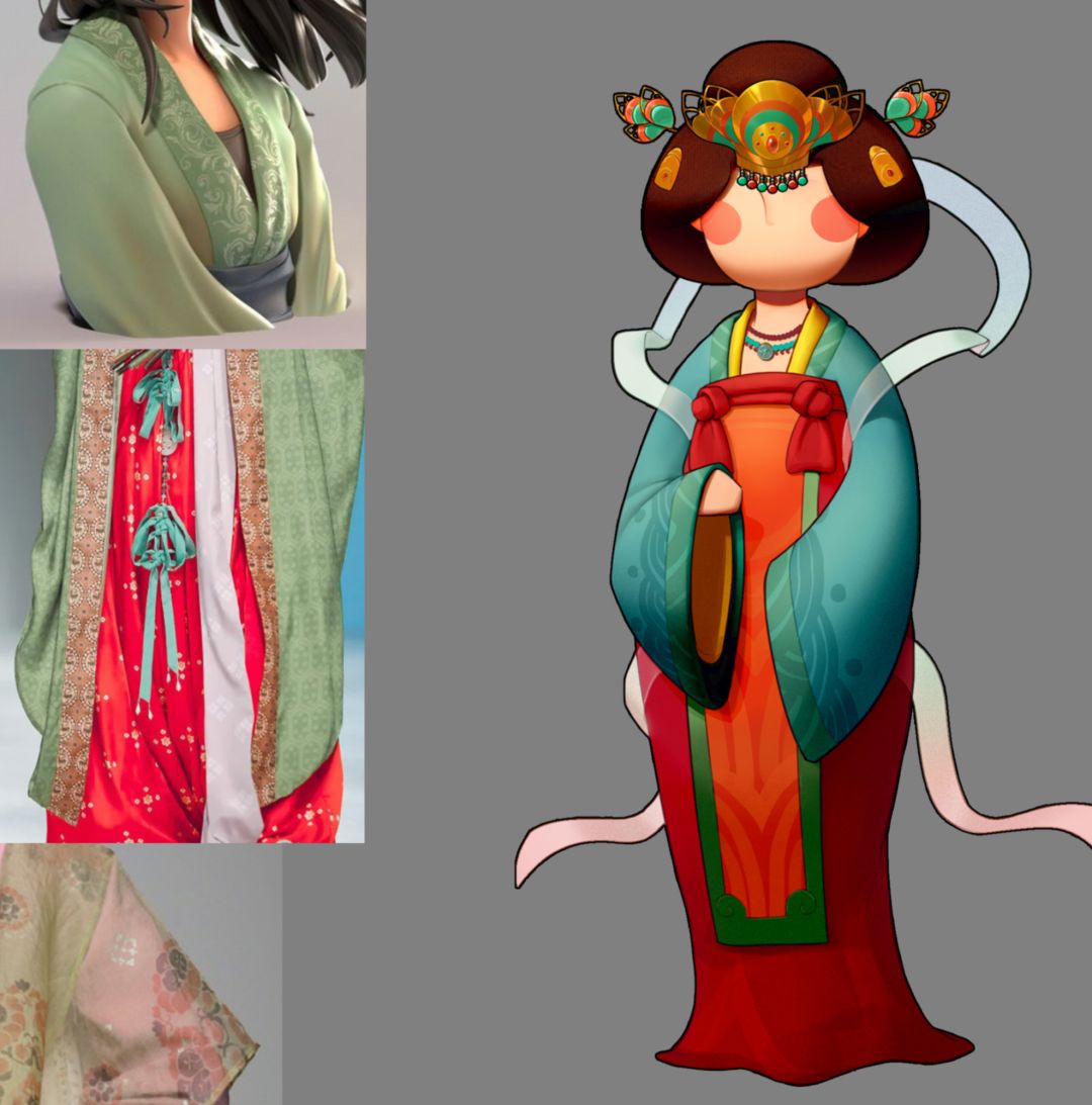 造型从早期到最后成型花了原画同学很长时间,早期的公主相对偏瘦,考虑到唐代有以胖为美的审美特性。原画同学就寻找方法来使公主的形象丰满起来,但同时又不想过分体现身材或者姿态。所以,最后在一些唐朝侍女陶俑上找到了灵感,以陶俑为蓝本逐渐让人物造型圆润可爱起来。