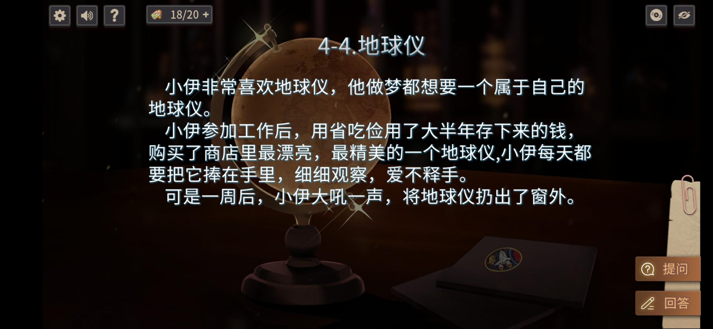 但4-4这一关,我只用了三个,当我问出地球仪无用是,我便才出了汤底。