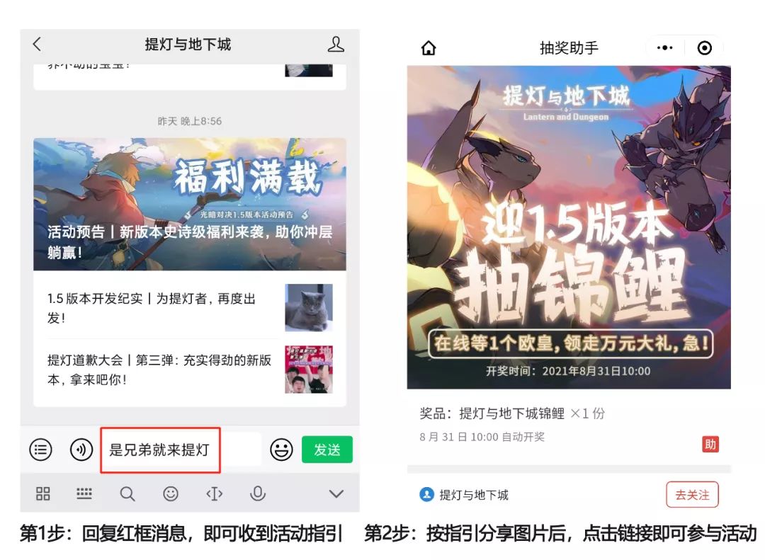 第1步:微信搜索”提灯与地下城“公众号,在后台发送【是兄弟就来提灯】