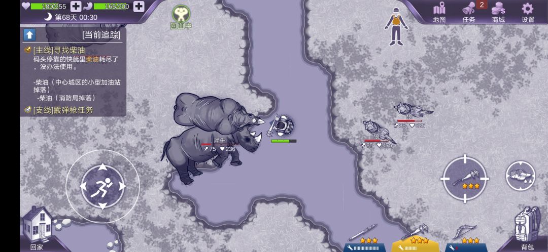 打犀牛时,被犀牛给顶到了河中间,我打不到他,他也打不到我,没办法只好回家,再来时,犀牛尸体已经被刷新掉了