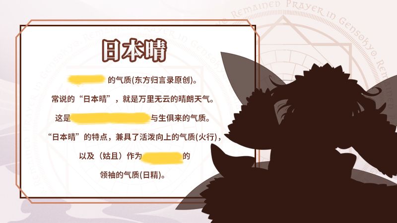 “日本晴”的特点,兼具了活泼向上的气质(火行),以及(姑且)作为光之三████的领袖的气质(日精)。