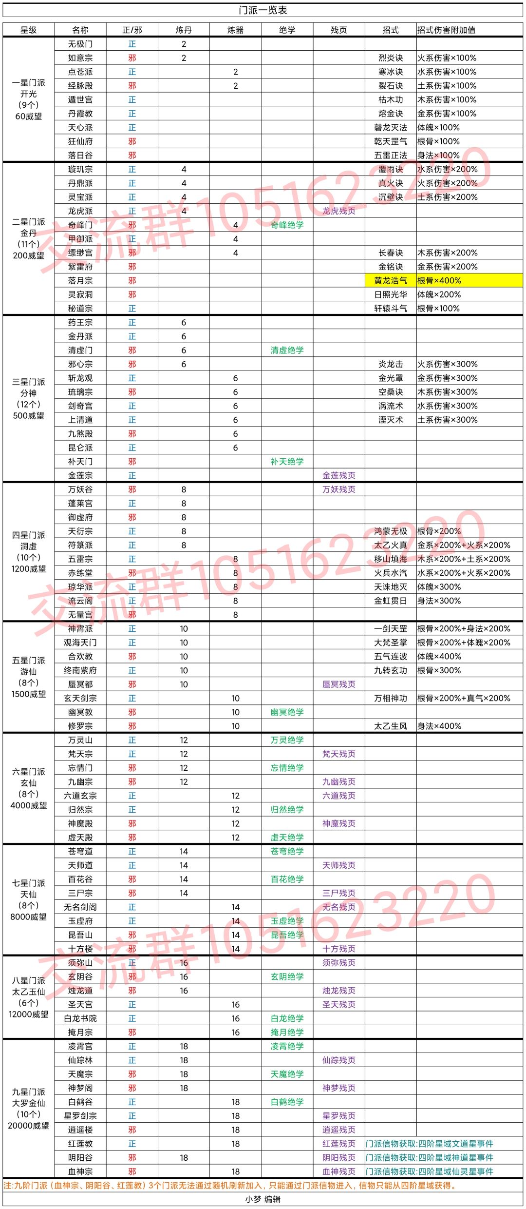 最新完整版门派表格