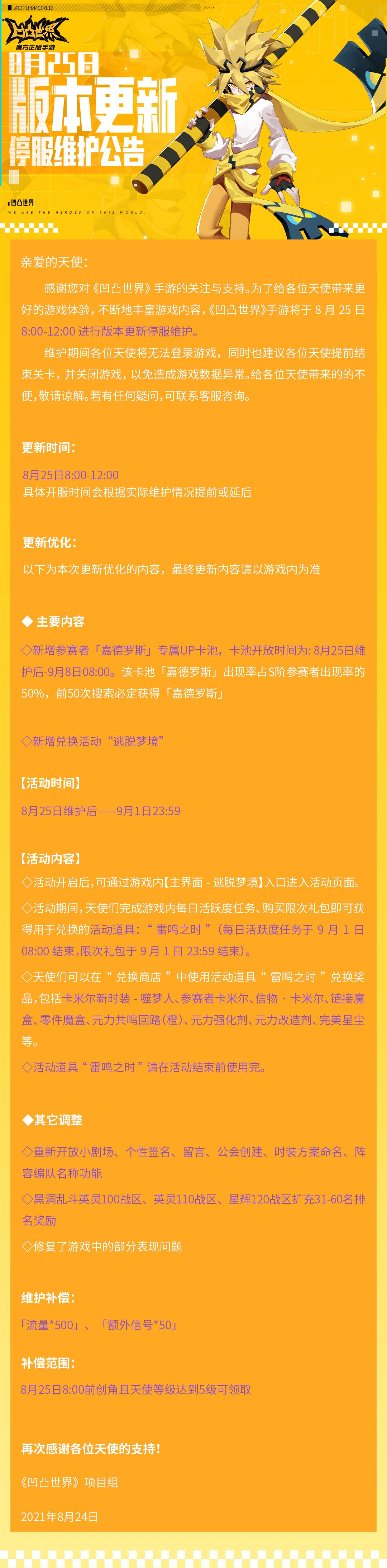 感谢您对《凹凸世界》手游的关注与支持。为了给各位天使带来更好的游戏体验,不断地丰富游戏内容,《凹凸世界》手游将于8月25日8:00-12:00进行版本更新停服维护。