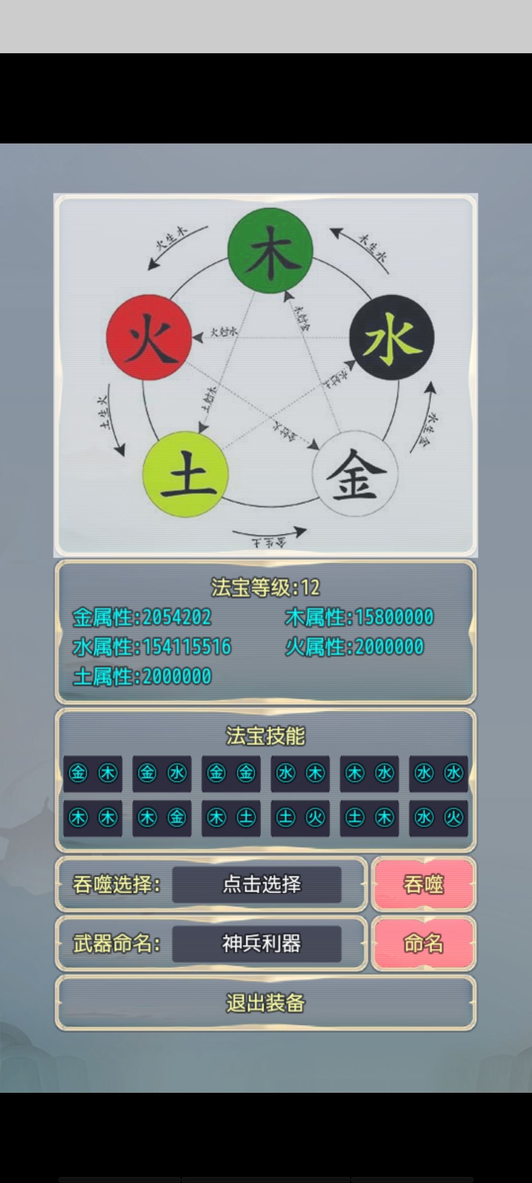 金木水火土 为法宝的五个属性 其中金为普攻,木为生命,水为恢复,火为法伤,土为防御攻击