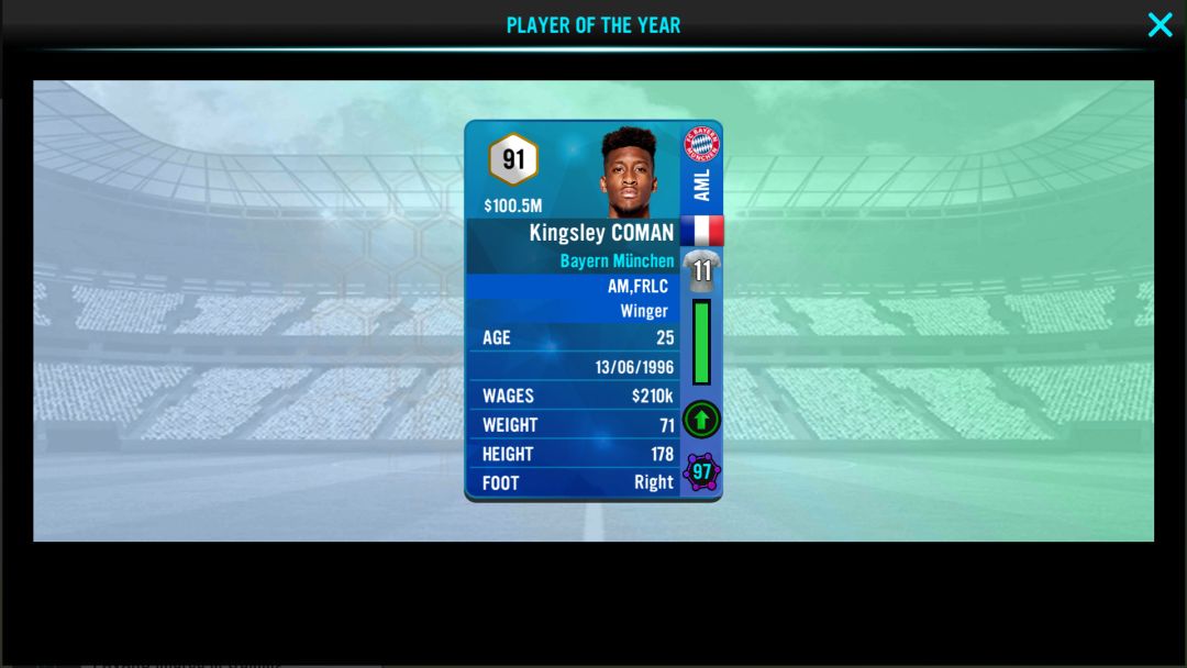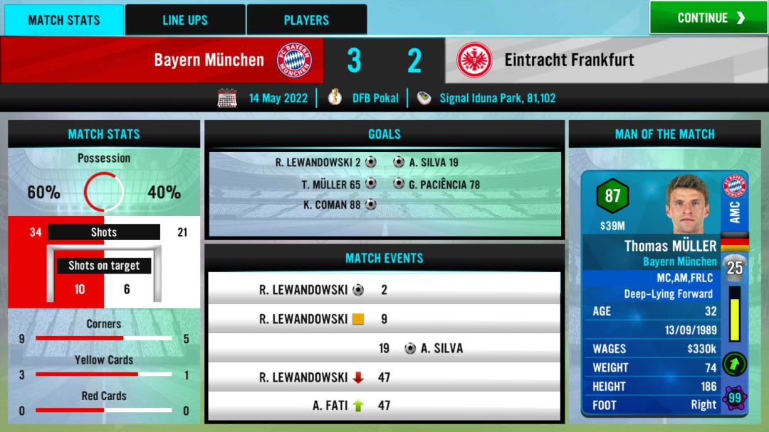 11、德国杯对阵法兰克福,88分钟科曼绝杀帮助球队3-2法兰克福捧杯