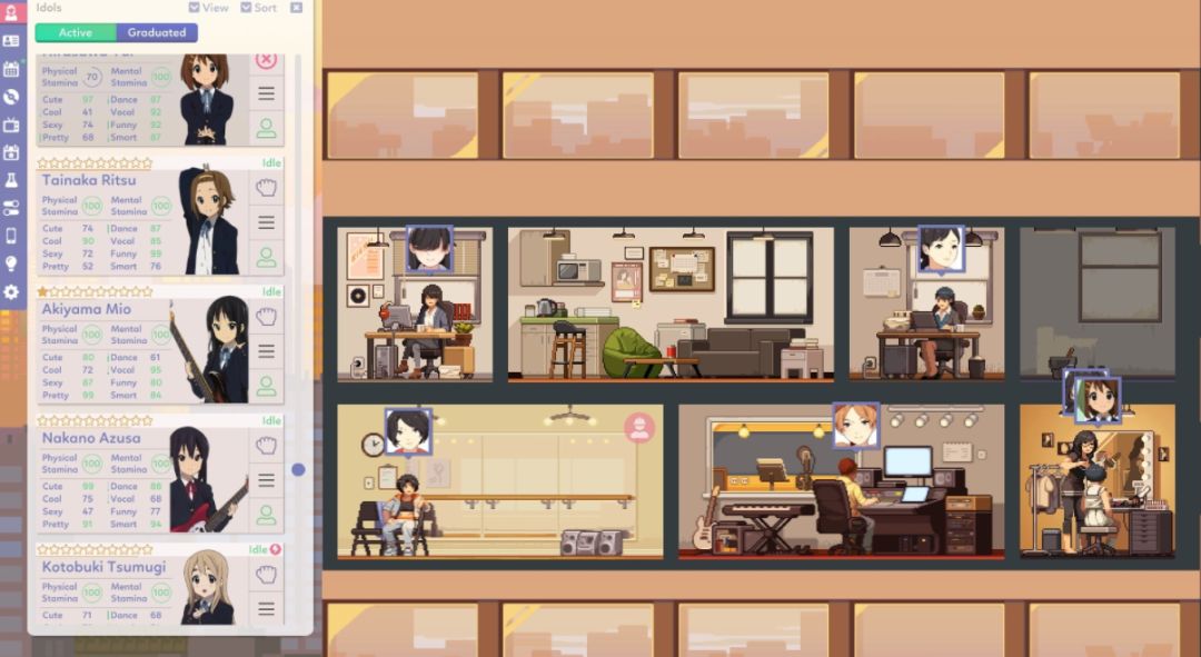 这是一款模拟经营游戏,在这个游戏里你扮演偶像团的经理,决定团里所有的大小事务,还会遇到各种各样的随机事件,比如发生了团内恋爱,你要决定是拆散还是默许;