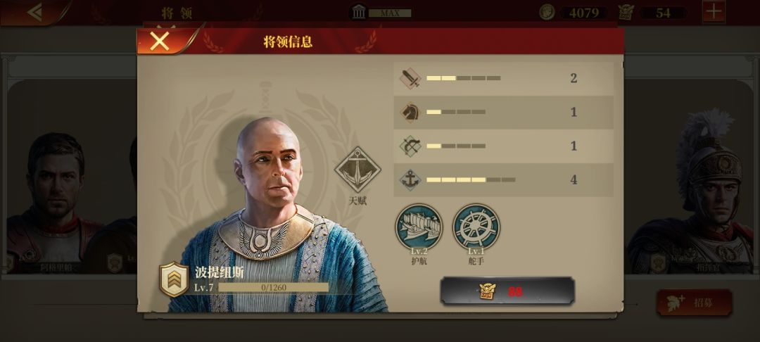 性价比说实话一般,相对于军衔亏了69块钱。技能相比于前两个来说要好上不少,天赋是个不错的天赋,虽然有触发限制,但是暴击率比一般的暴击天赋更高,再加上自己有一个暴击技能,让他和澳德罗斯成为了全游戏暴击率最高的将领。伏击也能提供一定的生存能力基础星星有点少步兵只有七颗,而海军只有六颗。虽然从表面上来看暴击率高,而且还有一定的生存能力,不过这货性价比属实一般。伏击终究比不上盾墙再加上步兵攻击次数普遍比较少,所以也比不上游击战只能当生存能力的一个非常低级的保障,但是提升非常有限。基础面板不高,让他想获得高额的输出必须卖血,或者获得士气但是一般情况下,步兵本来就很难获得信息,更何况他的实力还当不了主力步兵综合来看,它的性价比是非常差的,虽然相当于上面几个战斗力增加,还是非常明显的但是依旧不太推荐购买。差不多和塞多流一样,都是历史上很牛逼,在游戏里面直接被做崩。
