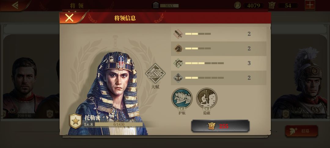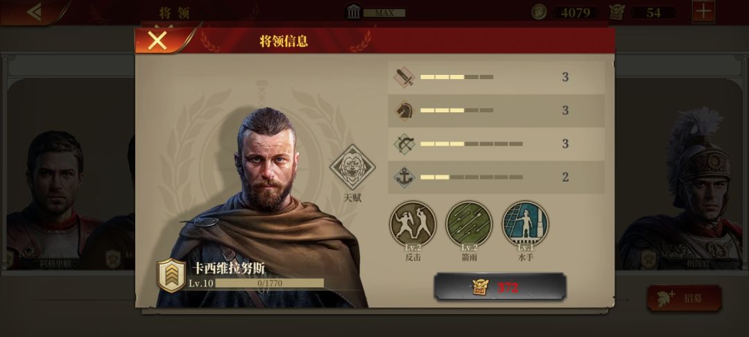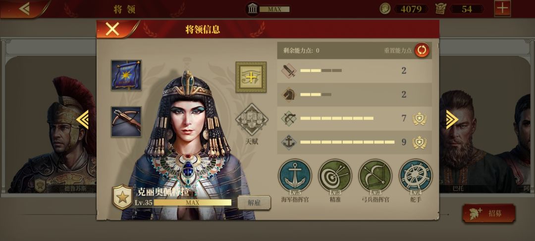 属性方面:由于是低级铜将,所以本身属性并不是特别强悍。最高的骑兵也仅仅只有六颗星,而专业海军也只有五颗星。