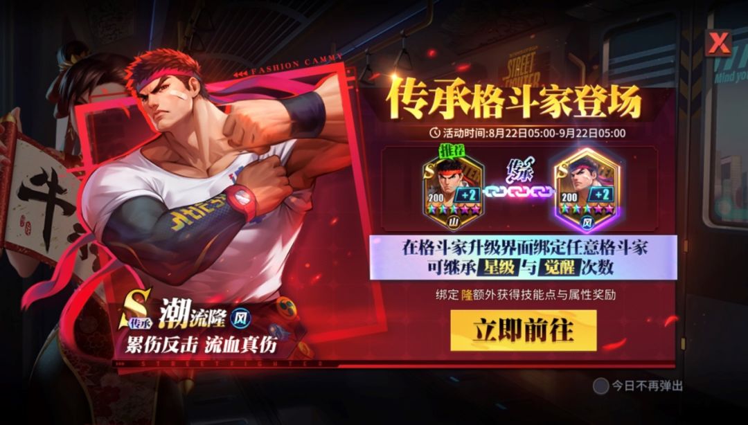 8月22日,《街霸:对决》开启了潮流隆限时传承活动。即日起至9月22日05:00,大家参与活动可获得传承格斗家潮流隆。