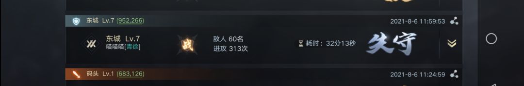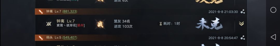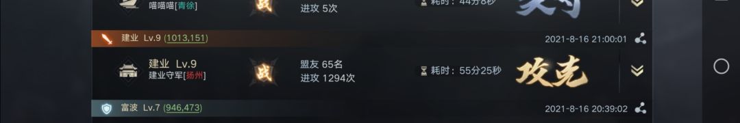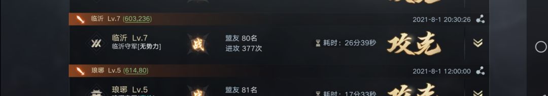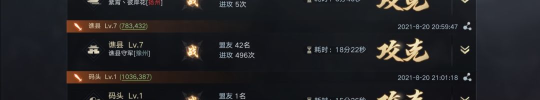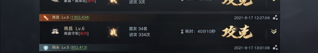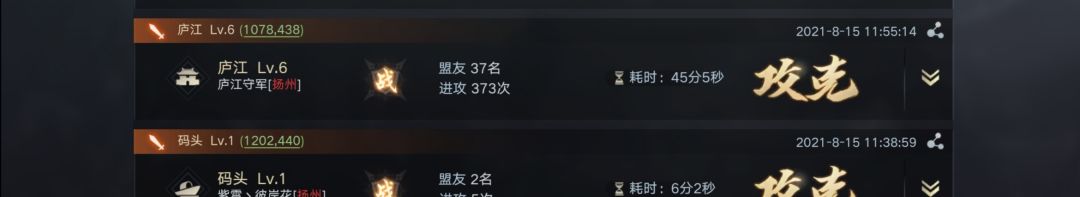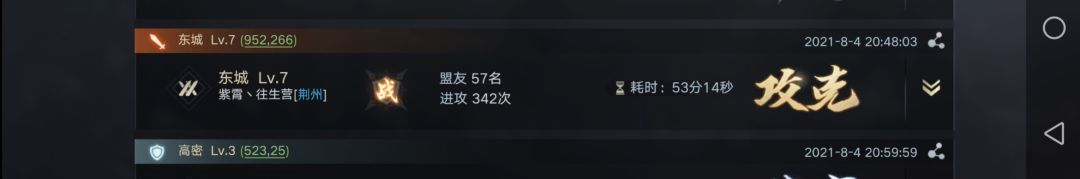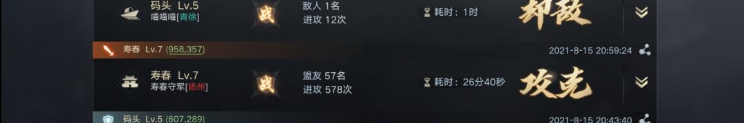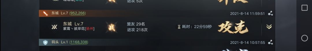 事实上参战盟友不止57人。在攻城准备期间,许多人停留拆迁被击回,营寨被拆。与击破资源州时的人数做个对比。