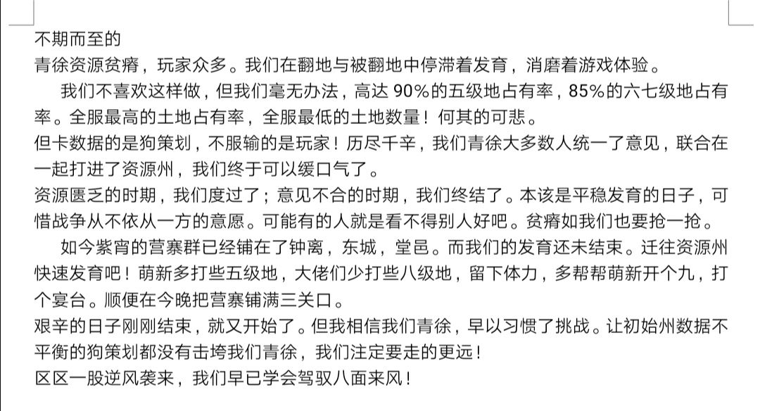 第一:紫霄兵扣三关卡时,为了防止低战受损,管理“启明”下邮件让玩家尽快搬入资源州。这种空间换时间的避战思路不能说错误,因为这一策略,青徐在被破关当日没有受到什么损失,但在幽冀正面迎战紫霄,需要青徐齐步跟上的时候就不合适了。部队调动距离远,迁城卡CD,东城的补给完全跟不上了。