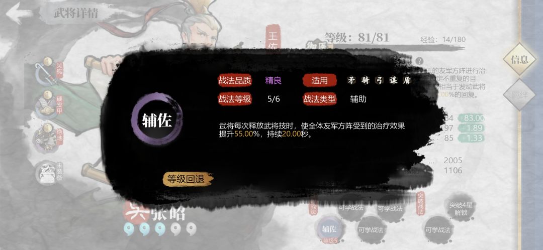 还有这几个紫将,推图神器。朱燃张昭放一起,全程覆盖增疗55%。我前排配的蜀将多,刘备跟朱然放一排大概全程蜀将减伤20%,增伤20%。陶谦的后发制人也要点起来。各种叠减伤加治疗,172城后开始手动,前排从来没倒过,战损不过50。