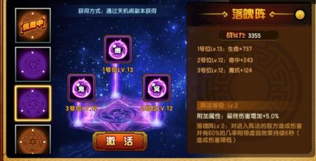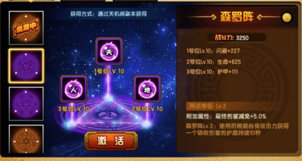 2. 阵法:65级开启阵法系统,目前主要有四个阵法,两橙两紫。