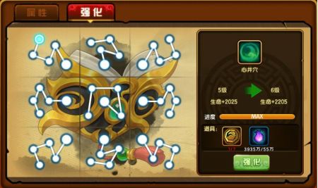 总共有45个孔,每五个孔有一个大孔,大孔加的属性和小孔一样,只是强化需要消耗的灵魂远高于小孔(血亏)。不同于炼体的越到后面加战越快,心法是开始几级加的很快,随着强化等级的升高,需要消耗的材料和灵魂也大量增加,因此会延缓加战速度。