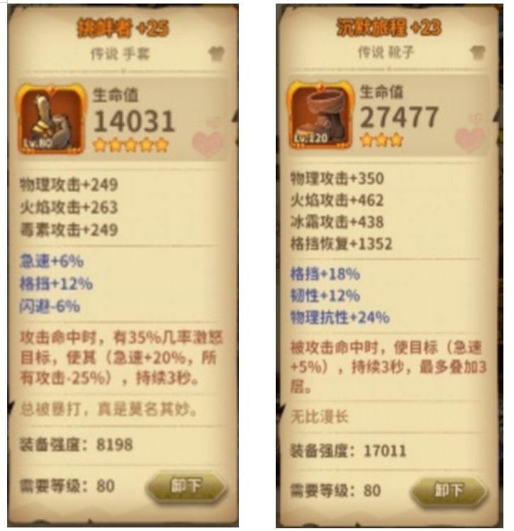 手套挑衅者,减少敌人攻击25%,挨打更不痛,还能让敌人增加急速,挨打频率更高,我建议这装备介绍改成你过来啊!