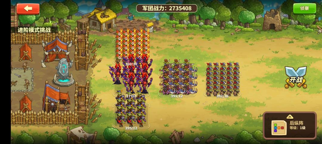 由于前期军团数量较少,排兵布阵主要针对骑兵(冲后排)