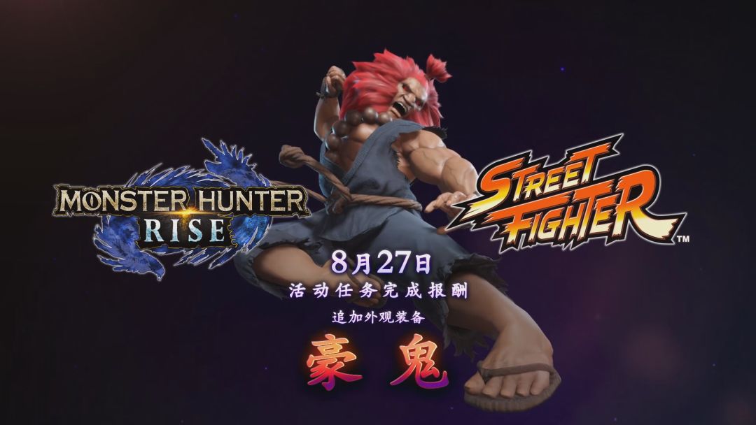 今日,卡普空发布《怪物猎人:崛起》与《街头霸王》联动公告,玩家可化身为《街头霸王》系列角色“豪鬼”,活动将于 8 月 27 日正式开始。