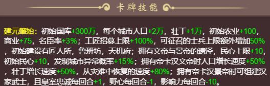 初始城池37座,农业商业两值都加。若有文景二帝。除了初期出兵会有点经济紧张。但是总体在现在橙卡系列之中是非常不错的。但要注意初期还是不要招兵和招工匠太多。(初期就可以招800万的工匠和兵)