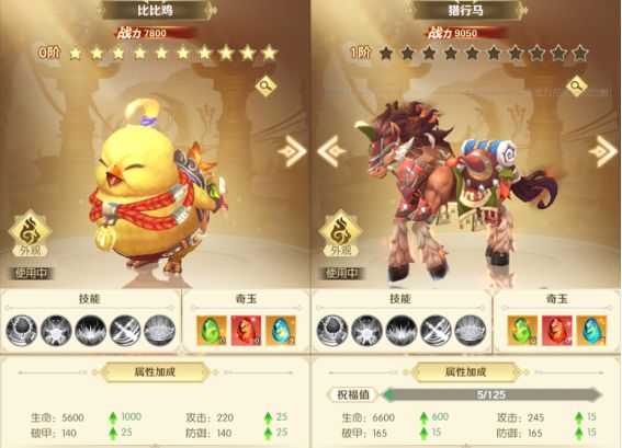 坐骑系统可以使用坐骑进阶玉与坐骑祝福玉提升坐骑祝福值,祝福值满后即可升星,坐骑达到十星后使用突破宝玉即可进入下一阶段。另外在外观上还可以切换为炫酷珍稀坐骑。