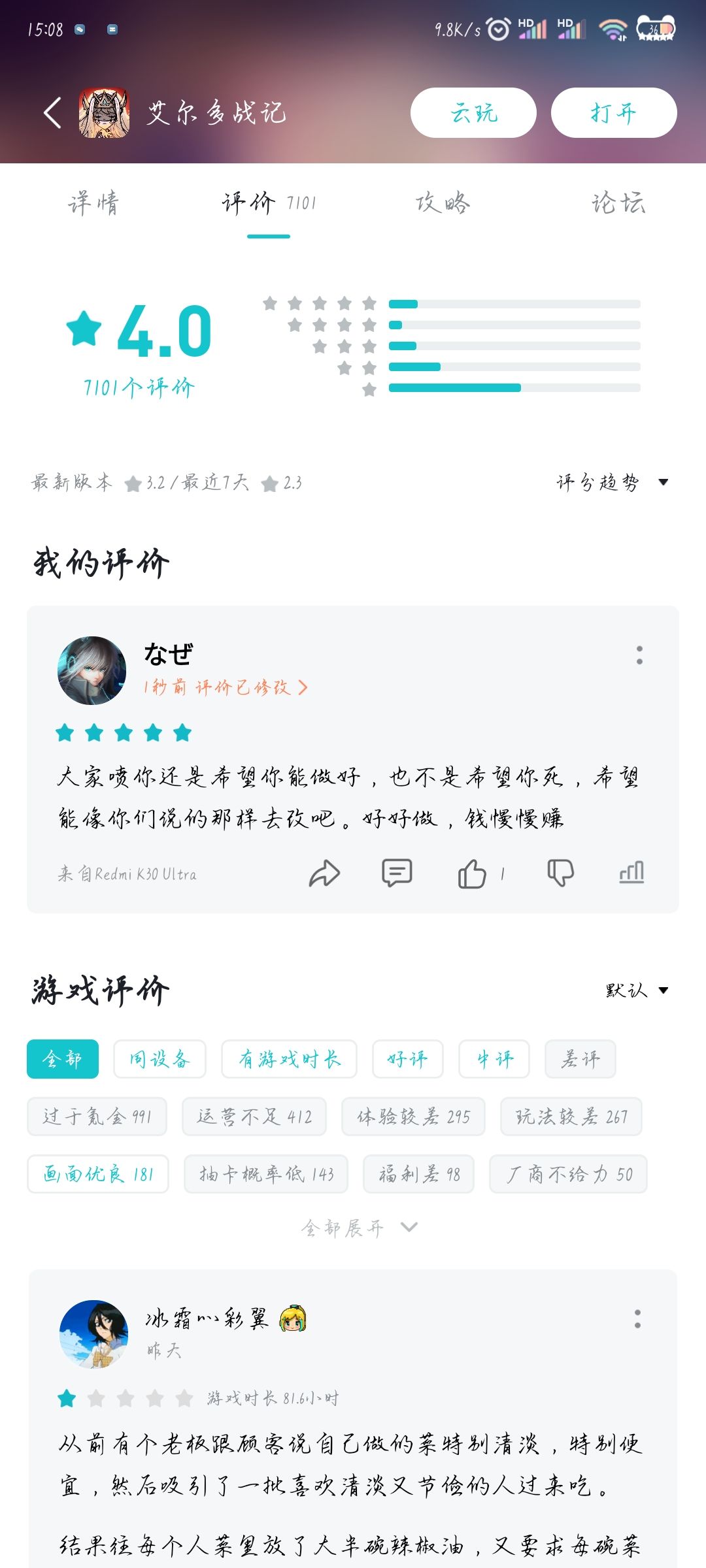 因为之前在官方的那封信里有提到改评论给券,后来又屏蔽了,所以我想作为一名玩家来告知这个事。首先我已经把一星改五星了,不管你觉得我是洗地的也好,因为50抽失忆也罢,都希望你能看完。首先我们要明确之前给差评是因为什么,为了什么:因为现在版本确实有很多脑残设定,而引爆玩家心态的就是开服一周出的那俩终极脑瘫活动。那我们给差评是为了什么,那些被劝退的人是明智的,确实这个游戏前面走的每一步都让人直呼离谱,但现在留下来的玩家呢,无论怎么喷,依然在玩这个游戏,依然觉得它在某些方面符合自己的胃口吧,比如我自己就是画风,另一个就是对于英雄的获取,确实他抽卡的几率感人,但他送了很多克隆,碎片,每天偶遇还能出一些碎片,让零氪玩家都能轻松9星盲女,这点对比某远征,我认为还是挺好的。现在,官方已经表态对于今后的改变,也给出了具体的方案,如果你对这个游戏依然抱有一丝希望的话,我希望能改一下评论给予好评支持一下,一方面可以鼓励官方,另一方面这也是我们之前给差评行为收获的时候呀,给他搞到6分送60抽不香吗![[嗒啦啦2_期待]](https://img-tc.tapimg.com/market/images/4586b6e33f74e054079a0d9aaed70aee.gif)