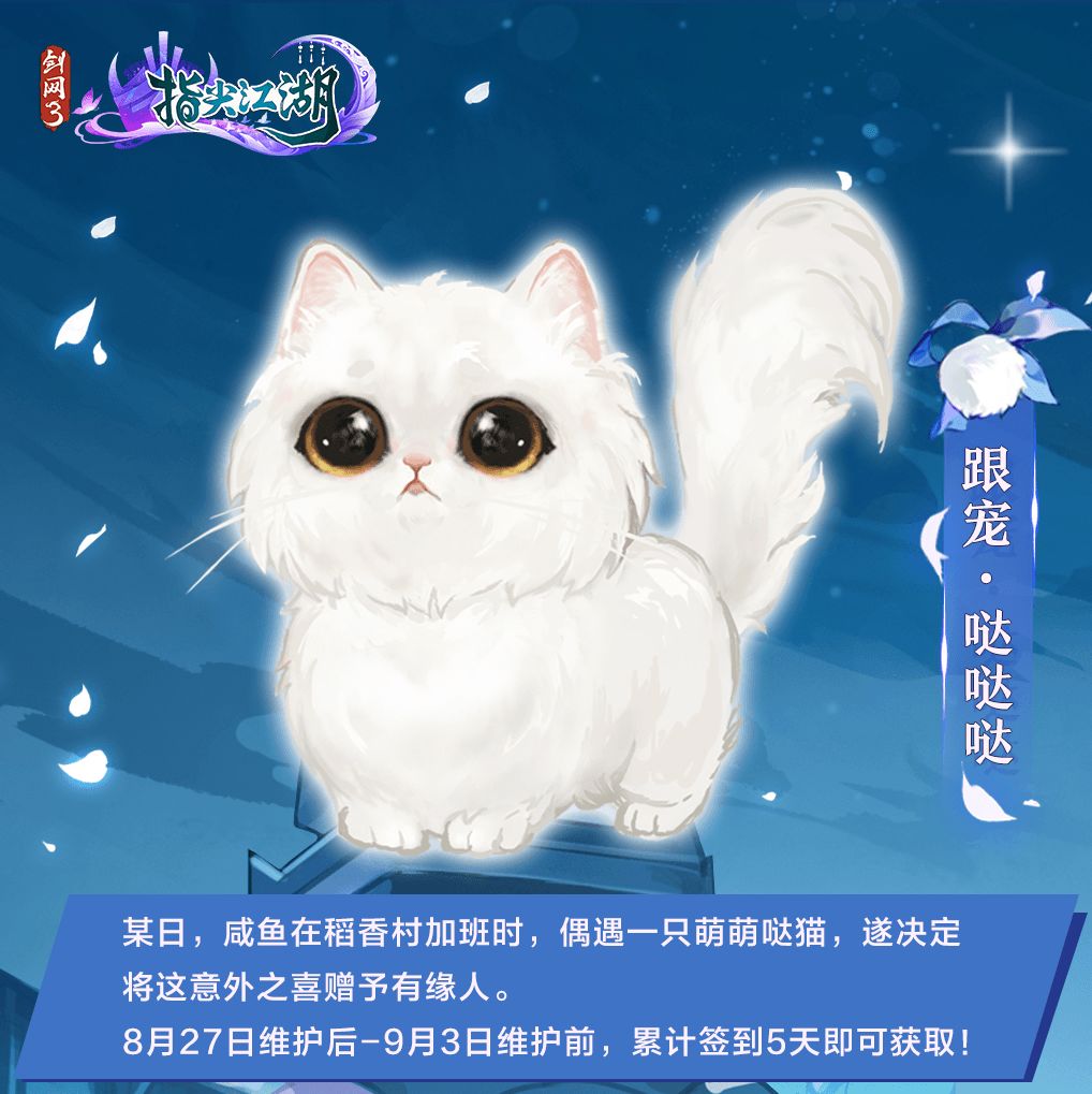 ★8月27日维护后~9月3日维护前,少侠累计签到5天即可获取白猫跟宠“哒哒哒”!