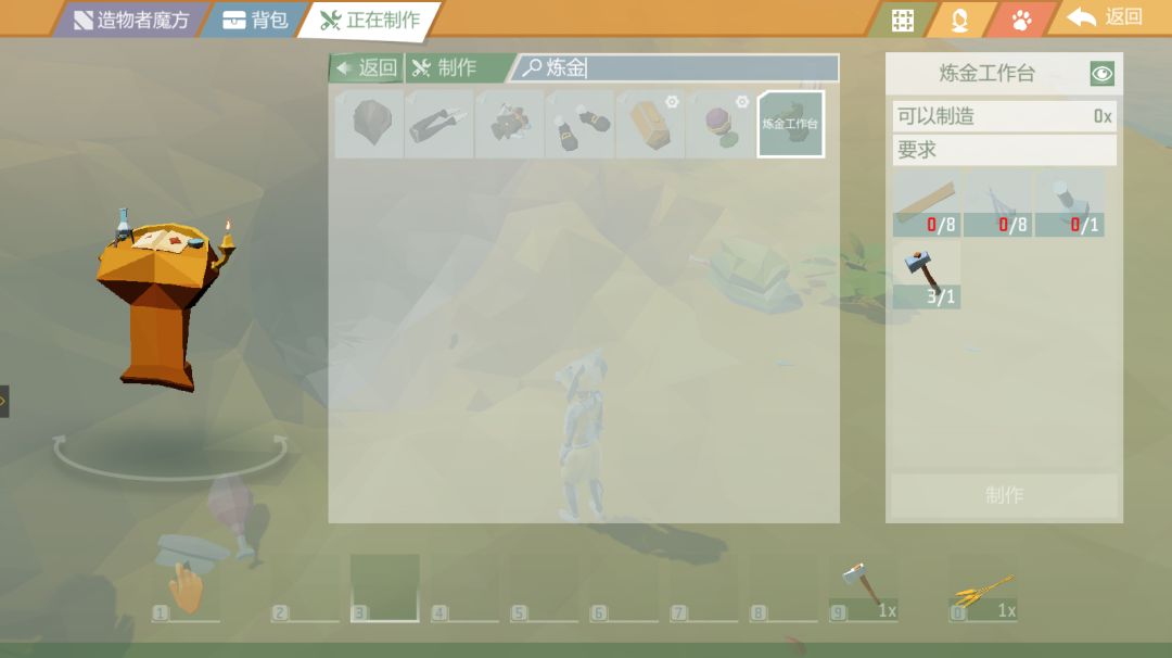 制作药剂一类的道具需要准备到“炼金工作台”。而制作炼金工作台的方法也很简单,只需要准备木板x8、钉子x8、玻璃烧瓶x1、任意锤子x1即可。小艾建议小伙伴们可以在升级到铁器时代后直接制作出炼金工作台,毕竟没有什么难度,都是一些基础材料。