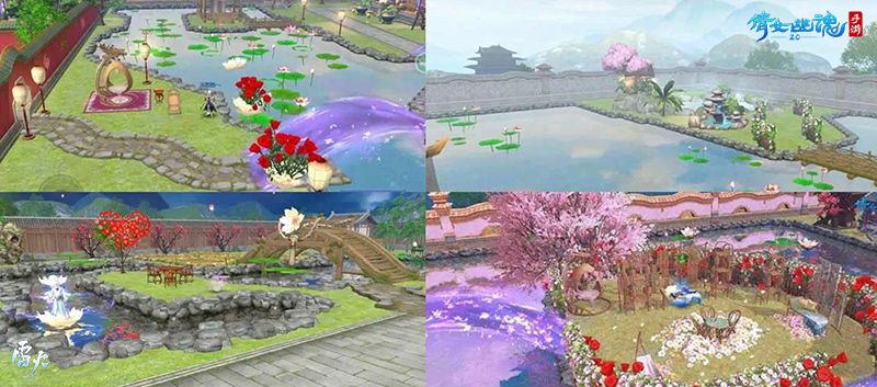 随着家园的焕新迭代,玩家热情高涨。众人纷纷开动脑筋,加入到布置的家园行列。有的玩家巧妙地利用新增设的水域编辑系统,在家园最深处挖出池塘与温泉。除此之外,玩家还在家园中设置了休闲区、宴饮区及花园,功能区分显得极有条理。有的玩家则将江南小桥流水的风格发挥到极致:在装饰物有限的条件下,选取了简约的设计风格,整体上保持了干净整洁,将有限的装饰物集中使用,突出视觉重点。另一方面通过水域编辑功能,利用水面丰富了家园的元素,打造出淡泊宁静小桥流水的景致。有的玩家的家园则是甜蜜浪漫风格,两座鹊桥架在水面,四周被盛开的花木包围,湖心岛更是唯美浪漫。还有的玩家打造出典雅宫廷风格的家园,红墙绿瓦搭配小池塘,极具古典园林美学。