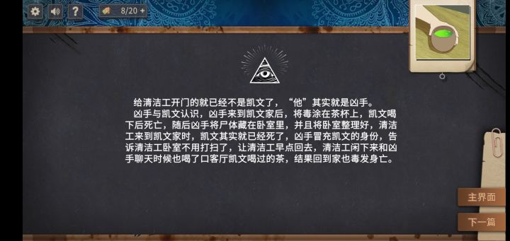 一开始看见这个否以为除了凯文和清洁工还有第三个人在凯文家,是这个第三者帮忙泡的茶,然后三个人一起聊天,导致第一个问题一直没能推出两个的死亡时间,死活都想不到泡茶是发生在清洁工来之前🙁