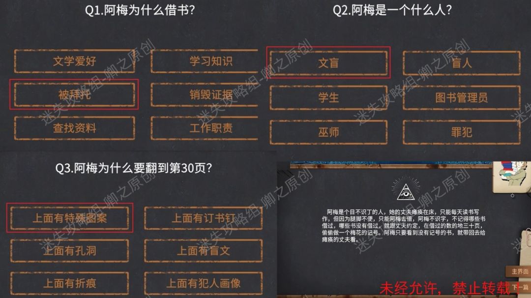 提示选项·「阿梅」:「为自己借书」(这个虽然是错误的但还是要点,解锁第2个提示选项「丈夫」)、「第三十页」(同时解锁第5个提示选项「某样东西」)。