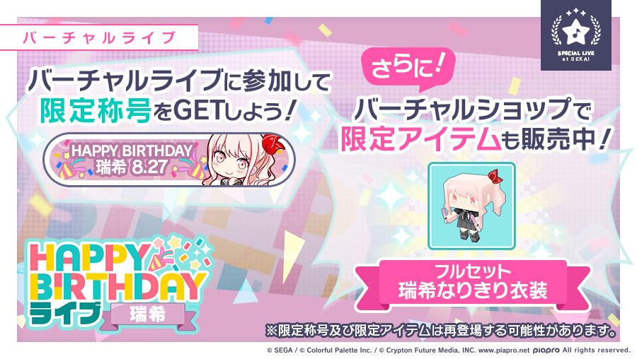 北京时间8月26日23:00起举办「HAPPY BIRTHDAY LIVE 瑞希」虚拟演唱会🎂